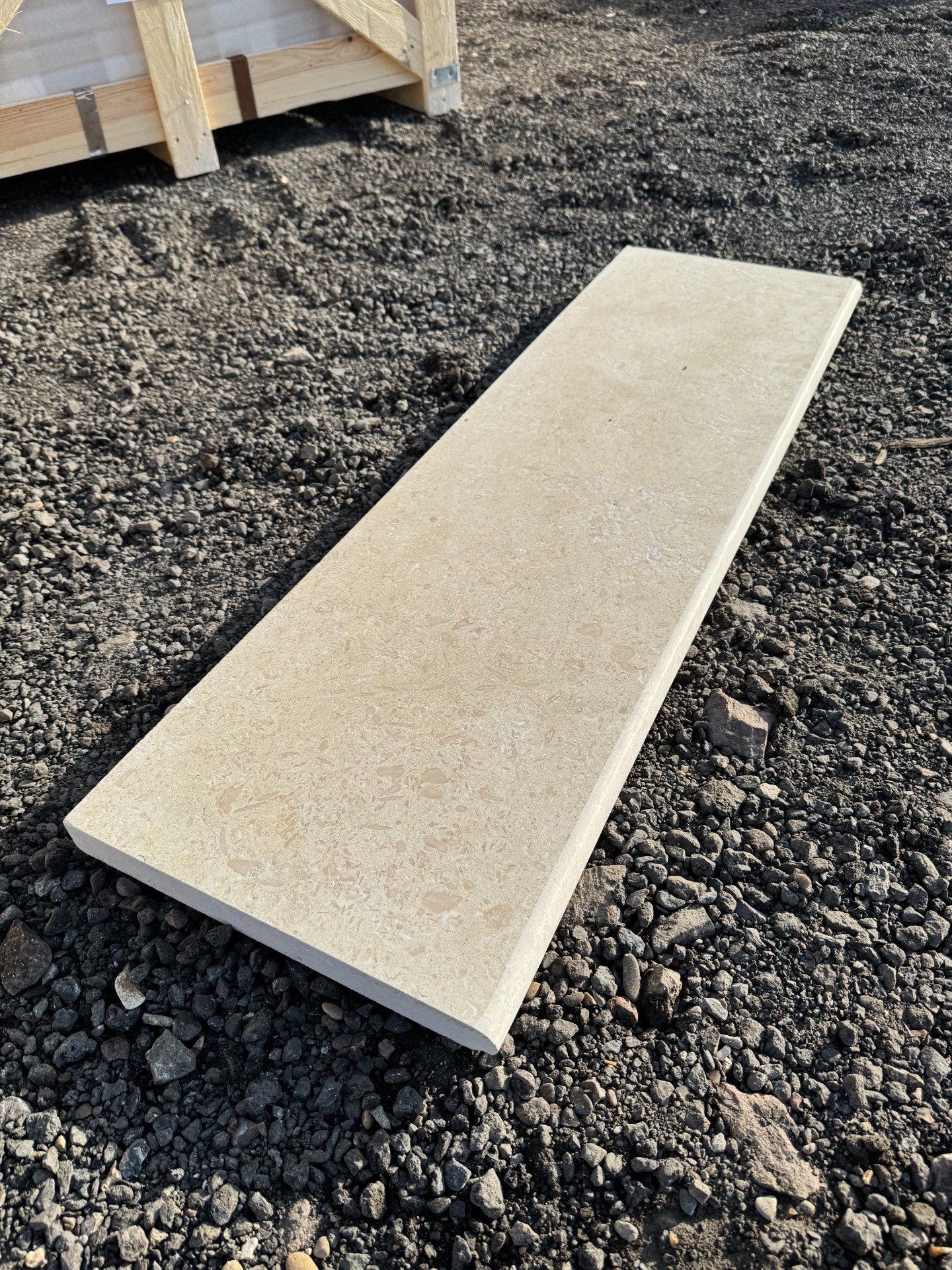 Le New Sunny (EN12670) est une roche sédimentaire carbonatée de type calcaire fossilifère de couleur relativement uniforme jaune or nuancé et nummulites (fragments de fossiles).