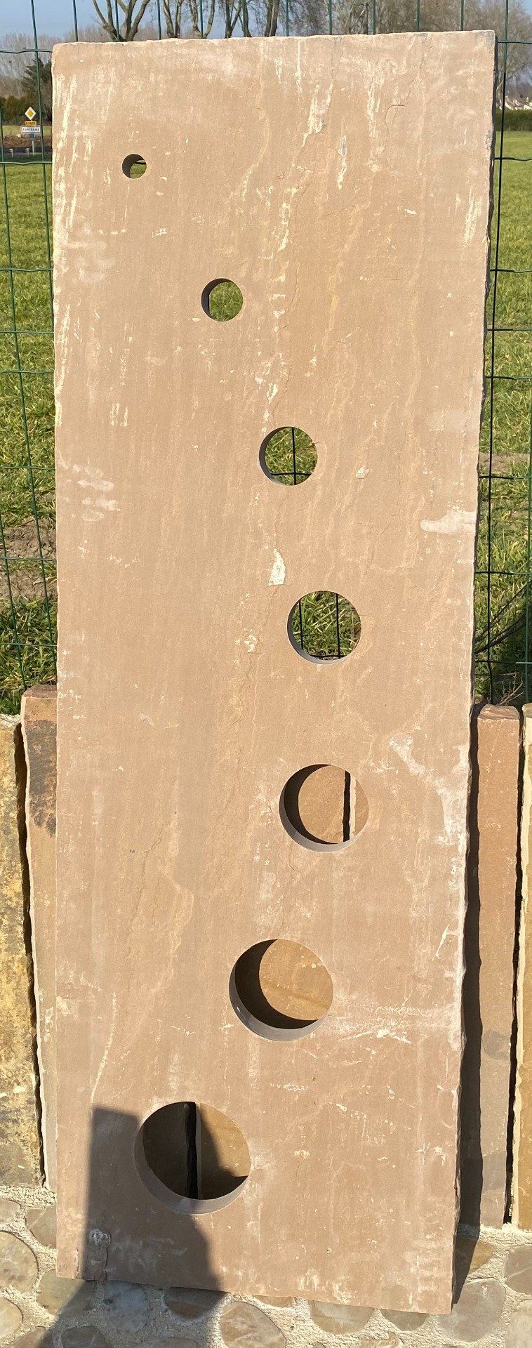 Matériau : Grès Kandla, pierre naturelle réputée pour sa solidité et sa résistance aux intempéries